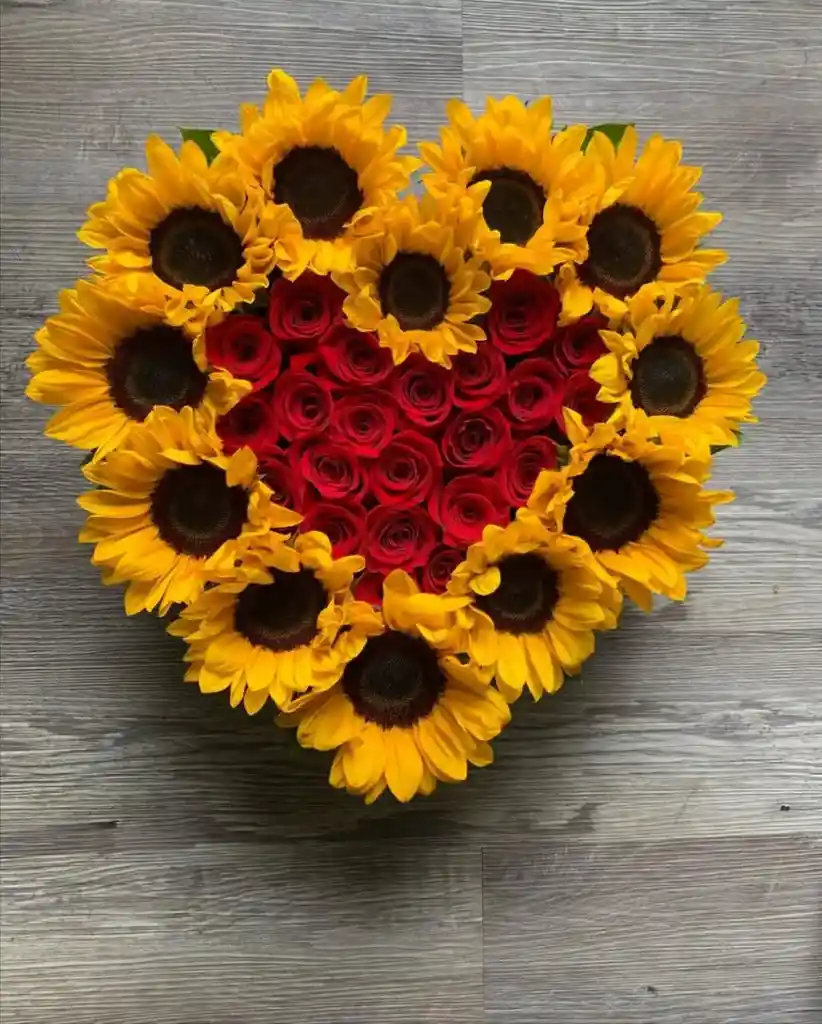 Este vibrante arreglo floral en forma de corazón combina la pasión de las rosas rojas en el centro con la alegría de los girasoles radiantes en el borde. La mezcla de colores cálidos y llamativos simboliza amor y felicidad, haciendo de este diseño un regalo perfecto para expresar emociones profundas y positivas. El contraste entre el rojo intenso de las rosas y el amarillo brillante de los girasoles crea un impacto visual único. para que nos regales tu mensaje de dedicatoria escribenos al whatsapp3171942265