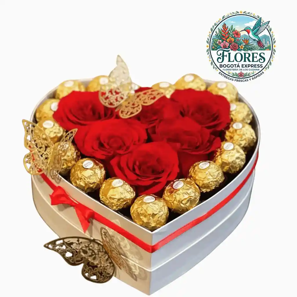 Delicado y elegante arreglo en forma de corazón que combina la intensidad de rosas rojas frescas con la dulzura irresistible de chocolates Ferrero. Cada detalle ha sido cuidadosamente diseñado para transmitir amor, pasión y sofisticación, incluyendo finos adornos dorados que realzan su belleza. Es el regalo perfecto para sorprender en ocasiones especiales y expresar sentimientos profundos de una manera única y memorable.