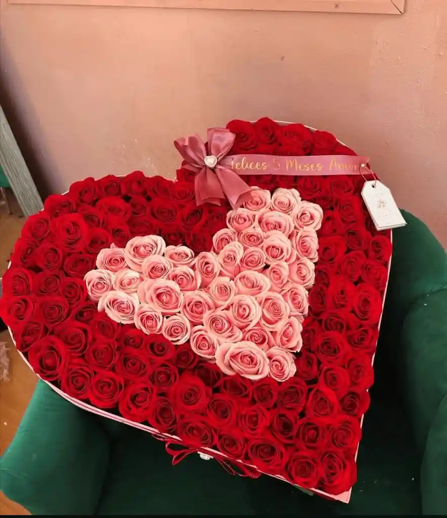 Caja corazon PREMIUM, con 50 rosas rosadas en el centro y 150 rosas rojas, con listón personalizado . Puedes contactarte con nosotros al (3171942265) para adicionar una tarjeta personalizada con dedicatoria o hacerle algún cambio a tu orden 😉🌹🎀
