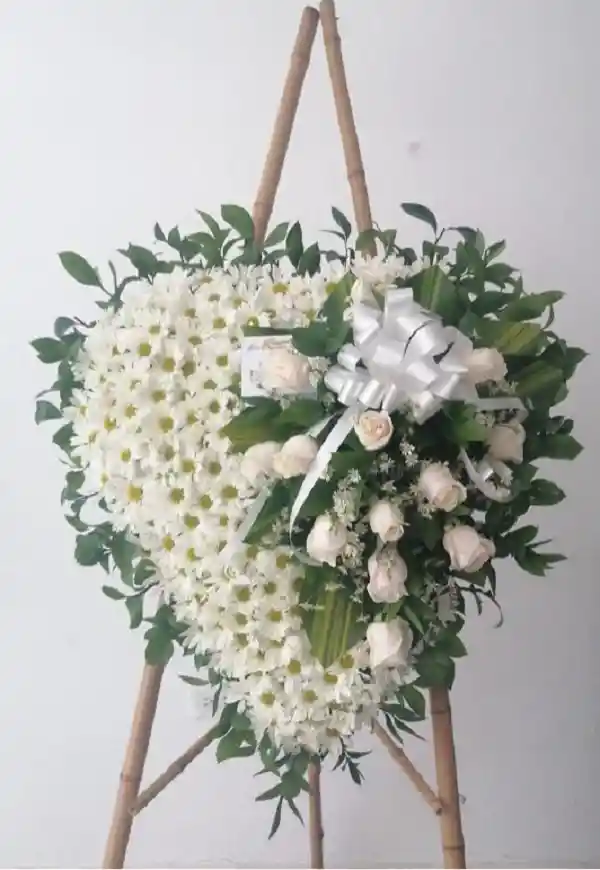 Corazón fúnebre elaborado con margaritas blancas, aplique con rosas blancas y tripode