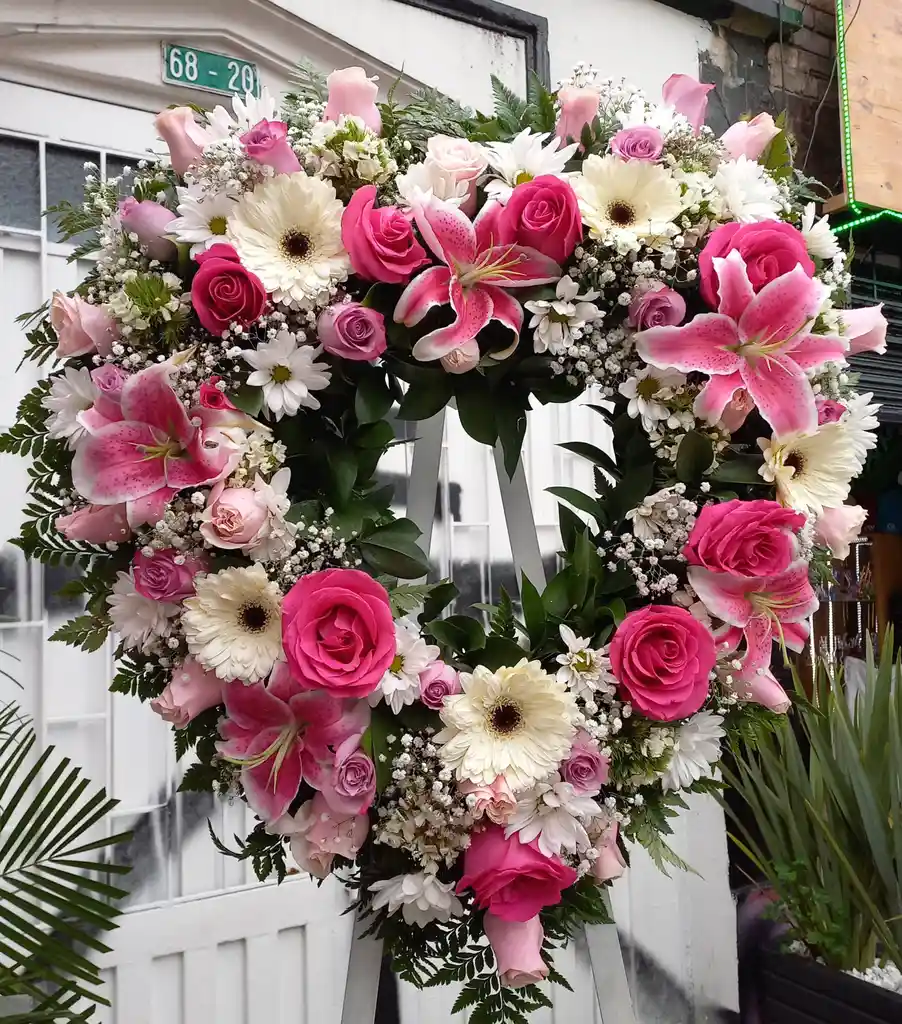 Arreglo fúnebre con rosas, yipso, cinta timbrada y soporte de madera