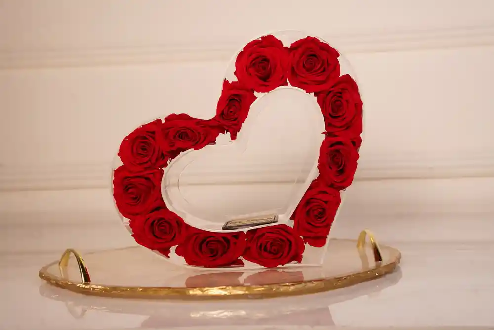 Hermoso corazon con cabezas de rosas preservadas tamaño standard en presentación de caja de acrílico Incluye tarjeta personalizada Duración rosa: año y medio No necesita agua. Mantenerlas en un lugar fresco y lejos de la luz directa. Perfecto para cualquier ocasión