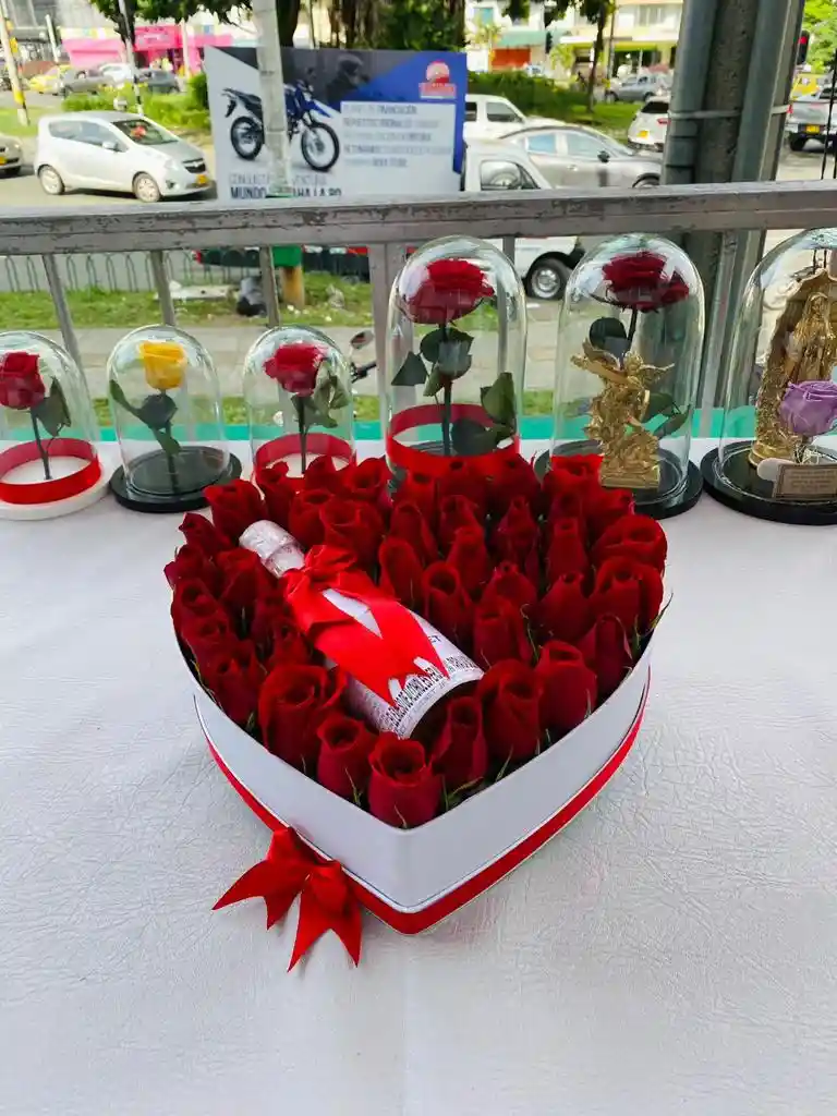 Hermosa caja de lujo en forma de corazón con rosas naturales rojas, acompañado de JP Chanet pequeña.