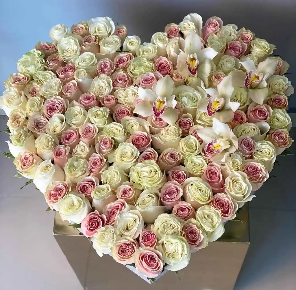 Corazon de 50 cm mdf de rosas con 5 orquideas