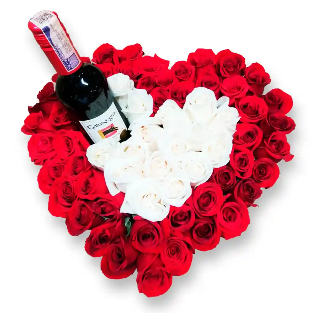 Caja de rosas en forma de corazón, 66 rosas rojas y blancas en el centro una botella de vino Gato Negro, ideal para la celebración.