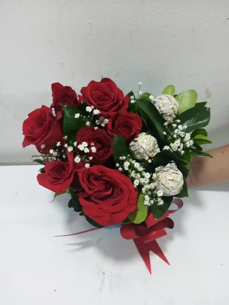 caja corazon 15 x 15 diametro con 7 rosas follajes y 3 unidades de chocolates