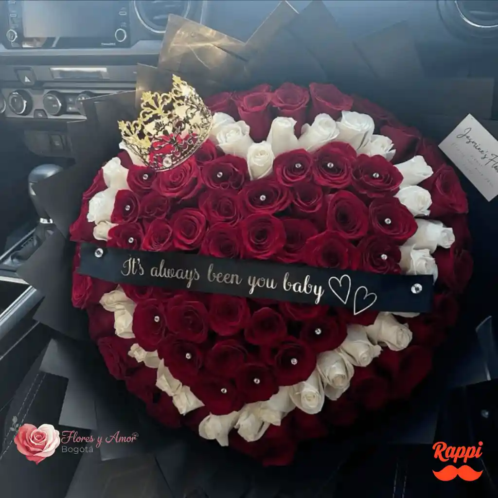 Un diseño impactante y profundamente romántico donde las rosas blancas son protagonistas, cuidadosamente acomodadas formando un corazón en el centro del arreglo. Este hermoso contraste resalta sobre un fondo de intensas rosas rojas, simbolizando un amor puro que destaca en medio de la pasión. Su estructura redonda y abundante crea un efecto visual elegante y llamativo, ideal para sorprender en aniversarios, propuestas, fechas especiales o declaraciones de amor inolvidables. La composición puede incluir detalles decorativos que realzan su estilo sofisticado y moderno. Incluye cinta con frase personalizada, permitiéndote agregar un mensaje único que haga aún más especial el detalle. El papel coreano se seleccionará de acuerdo a la disponibilidad y a la opción que mejor resalte y armonice con el diseño del arreglo, garantizando siempre una presentación elegante y acorde a la ocasión.