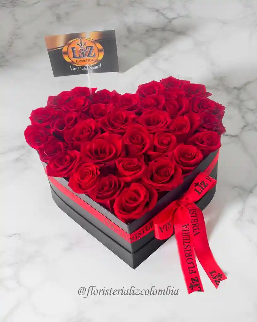 -Caja de Cartón en forma de Corazón -Rosas Naturales -Moño en cinta de Tela -Tarjeta de Mensaje
