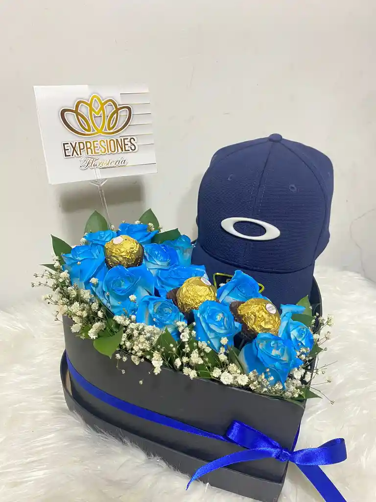 Rosas azules Caja corazón 3 chocolates 1 gorra