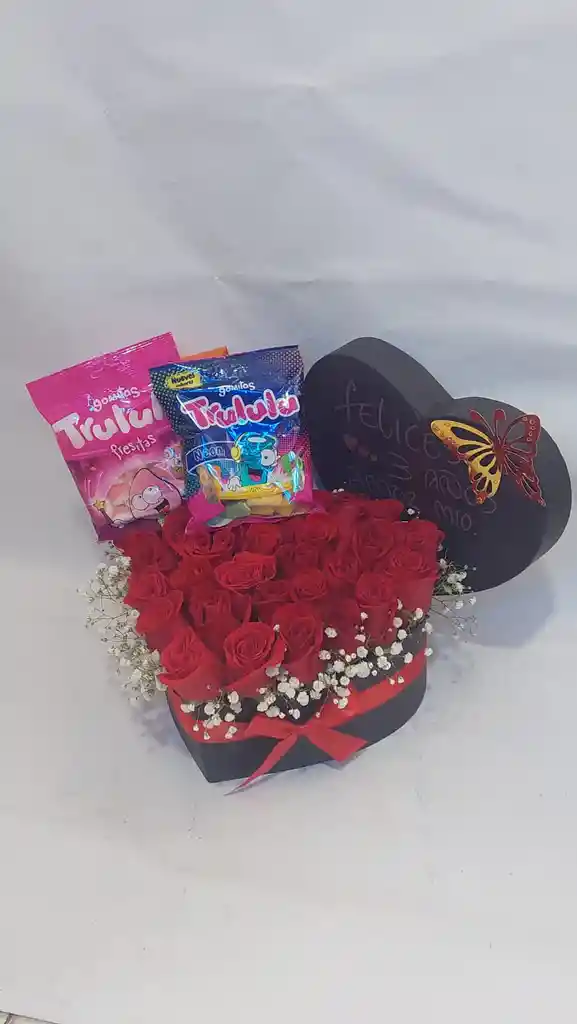 caja corazón x 24 rosas rojas con follajes y 2 bolsas de gomas según disponibilidad
