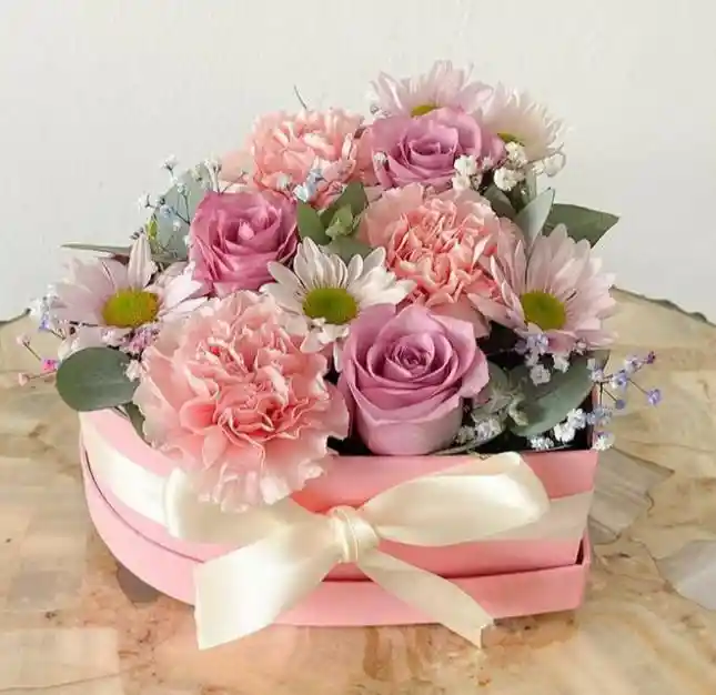 Un delicado poema hecho flor. Esta encantadora composición en tonos pastel mezcla rosas lavanda, claveles suaves y margaritas tiernas que, como versos de un poema, expresan cariño, ternura y dulzura. Cada flor es una palabra que acaricia el alma. Perfecto para regalar en momentos de amor puro, agradecimiento o admiración sincera. Incluye caja en forma de corazón con moño de satén. 💌 Tarjeta opcional: Puedes incluir un mensaje especial como: "Eres la estrofa más dulce que la vida escribió en mi camino."