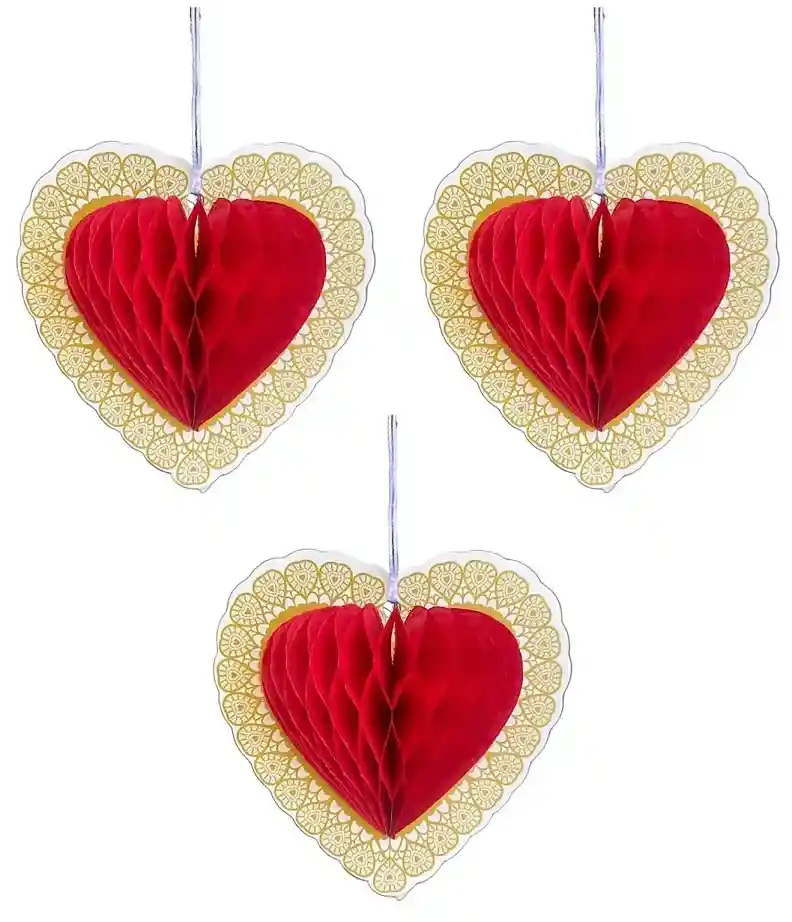Corazones colgantes 3D con estampado alrededor x 3 unidades. Cada corazón mide 11 cm x 11 cm.