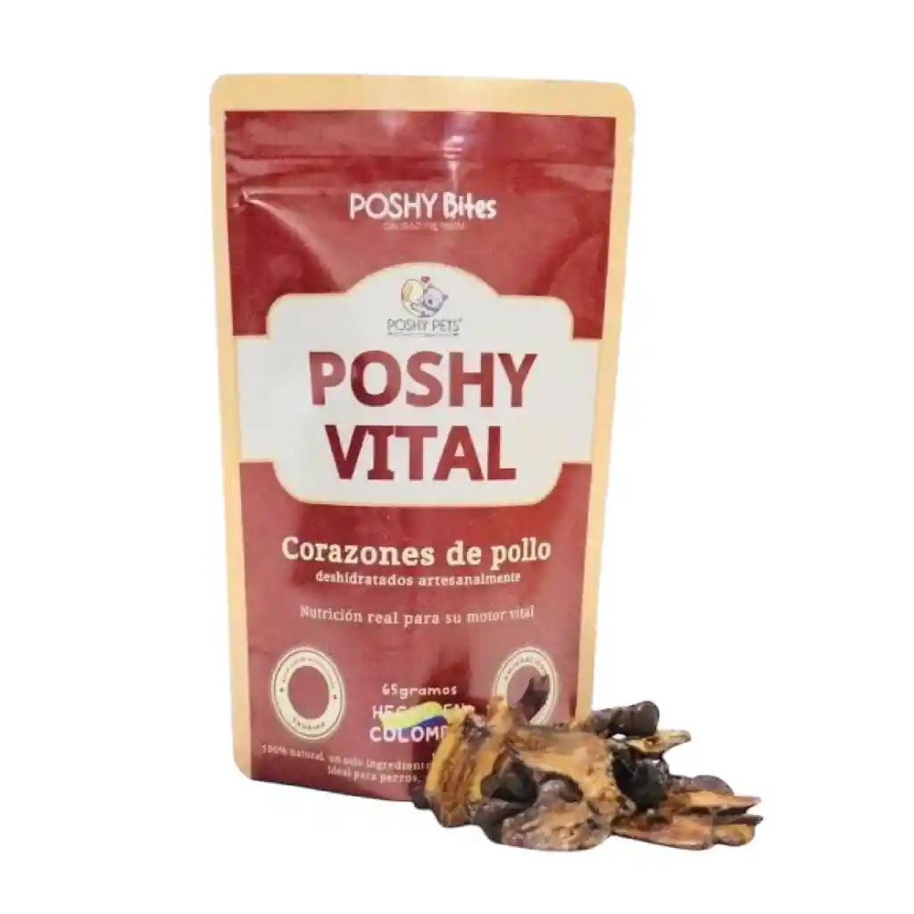 Tu peludito también merece algo natural. Energía directa al corazón. POSHY VITAL ofrece corazones de pollo deshidratados, una fuente natural y poderosa de Taurina y aminoácidos esenciales. Este snack funcional apoya la salud cardíaca y fortalece el sistema muscular de tu mascota con un sabor intenso que les encanta. Nutrición vital para una vida activa. Ideal para: Perros de razas grandes o gatos (por la taurina natural). Origen: Fabricación Local Colombiana Ingredientes: 100% Pechuga de pollo Presentación: Doypack con cierre hermético para máxima frescura. Uso: Complemento alimenticio / Premio. Peso: 65 grs Registro ICA: 01387002025