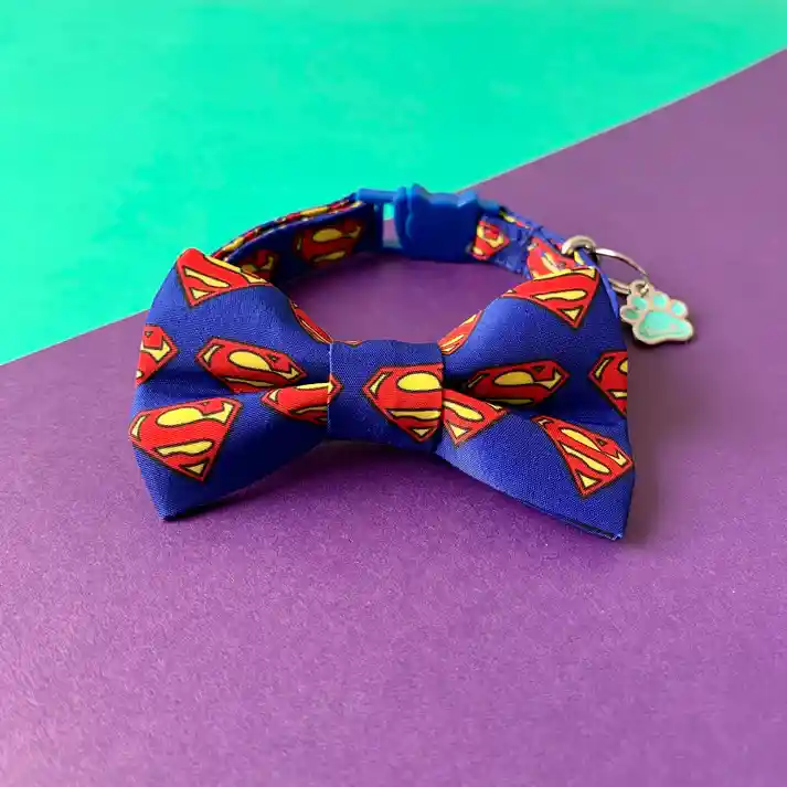 Corbatín para perros y gatos de Superman: un toque de elegancia y encanto en el look de tus adorables mascotas ¡siempre a la moda! 💜 Broche de seguridad disponible para gatos: diseñado para liberar al gato en caso de que quede atrapado. 💜 Diseños exclusivos. 💜 Corbatín con elástico, un accesorio versátil que se quita y pone fácilmente en el collar. ¡Dos en uno! 💜 Corbatín con tela interna para mayor firmeza. 💜 Collar ajustable con revestimiento de tela para una comodidad y ajuste óptimos. 💜 Resistente tela antifluidos. 💜 Incluye un encantador dije de huella en el collar.