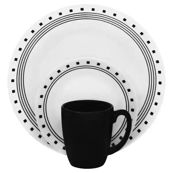 Con 4 Unidades. Cuadros y Líneas en Tonos Blancos y Negros le Dan un Estilo Urbano a Esta Vajilla. Rayas Negras y Cuadrados Dan a Esta Vajilla un Toque Urbano.