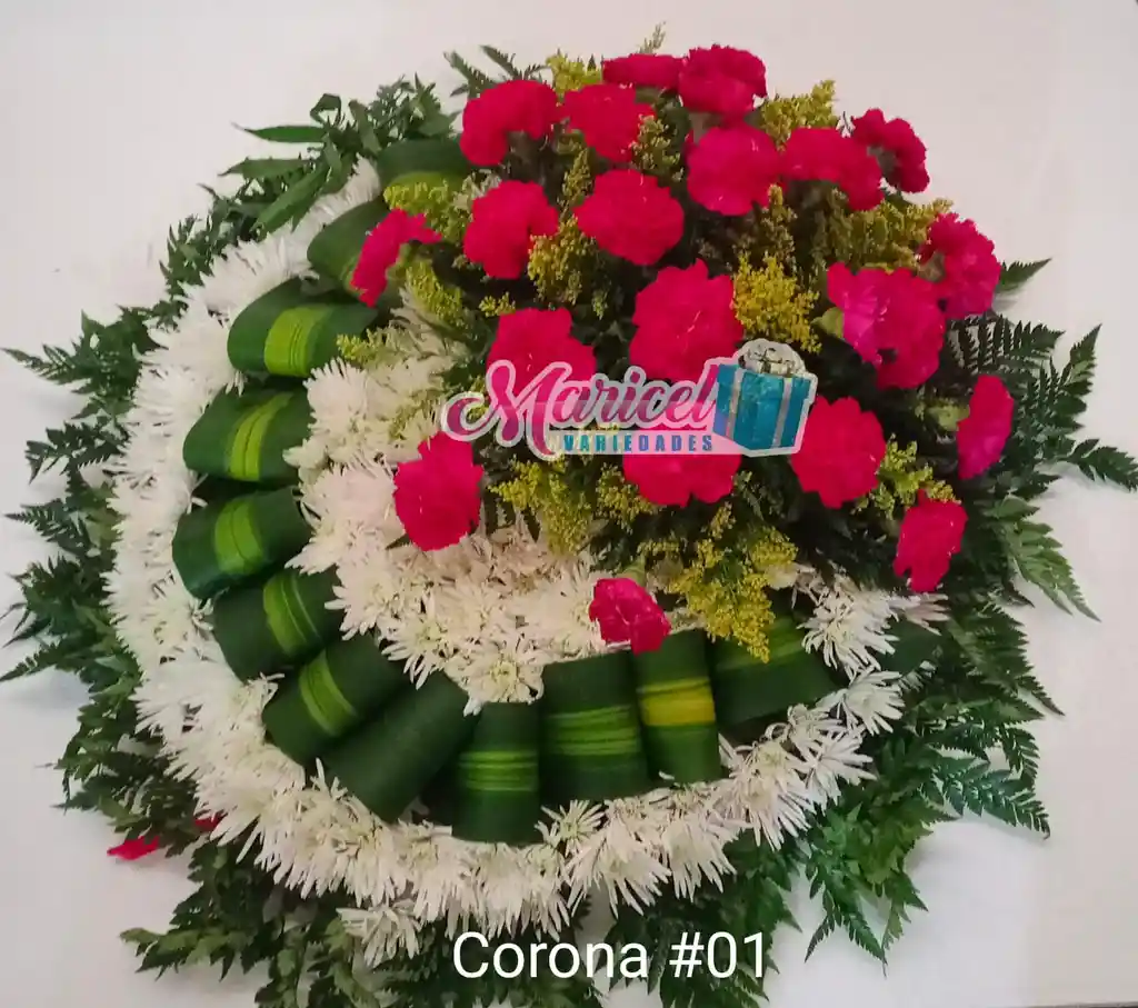 corona redonda con base blanca en margaritas, aplique con 24 claveles, hojas de dracena y sólidas ter, tarjeta personalizada