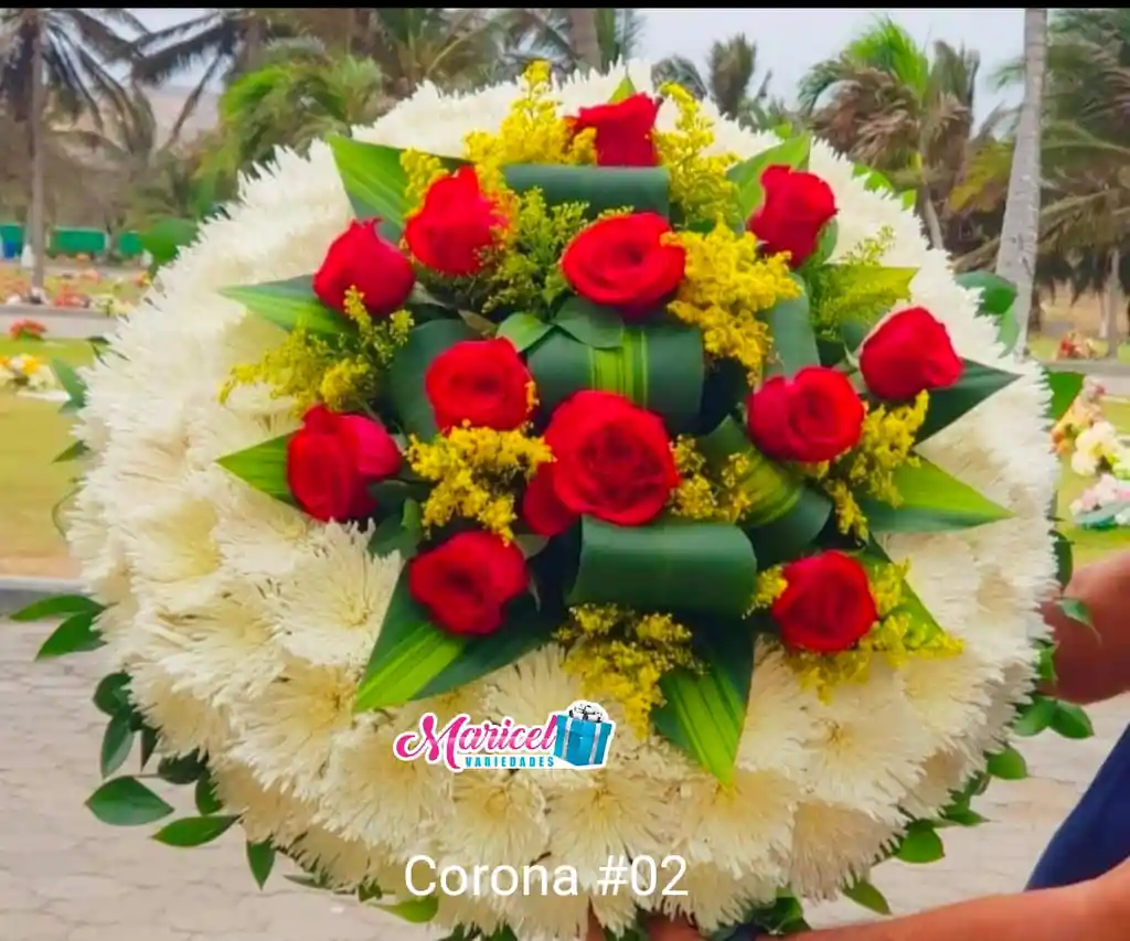 corona redonda base blanca en margarita y pompón, aplique con 12 rosas, hojas de dracena y sólidaster tarjeta personalizada