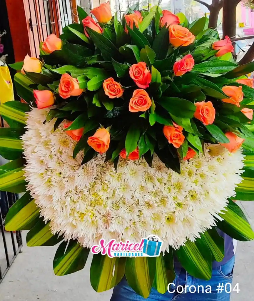 corona redonda base de margaritas y pompón, bordeada con hojas de dracena, aplique con rosas y cóculo, terjeta personalizada.