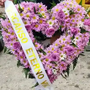 corona hueca elaborada con rosas y margaritas + cinta funebre