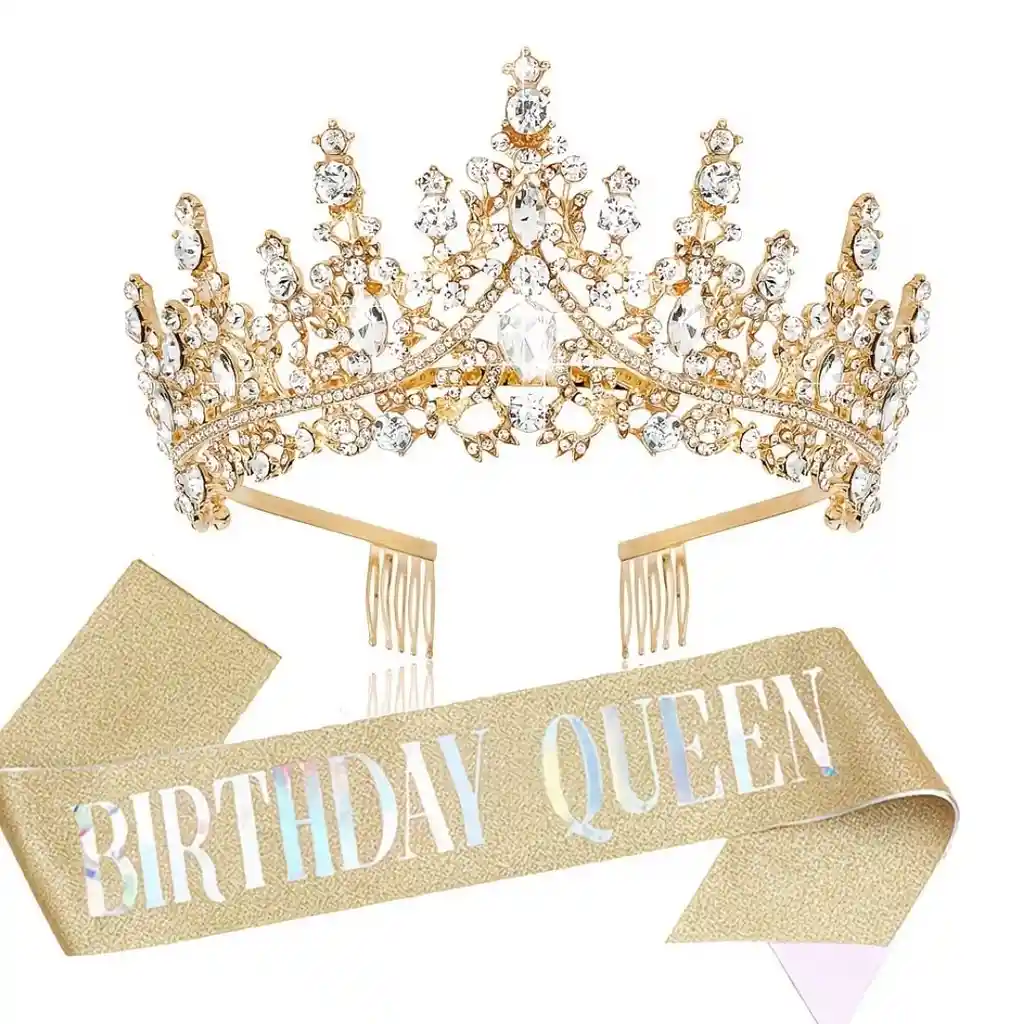 Celebra tu día especial con esta espectacular corona dorada decorada con cristales brillantes, diseñada para destacar en cualquier celebración. Su estructura metálica presenta un diseño elegante y simétrico, adornado con piedras transparentes que reflejan la luz y aportan un toque de lujo. Incluye una banda dorada con letras iridiscentes “BIRTHDAY QUEEN”, perfecta para complementar el look y resaltar tu protagonismo en la fiesta. Características principales: - Material: metal dorado con incrustaciones de cristales - Diseño: corona con peine incorporado para asegurar al cabello - Banda: color dorado con texto iridiscente “BIRTHDAY QUEEN” - Ideal para: cumpleaños, sesiones de fotos, despedidas de soltera o eventos temáticos - Estilo: glamuroso, festivo y femenino