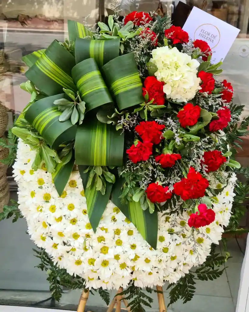 Corona Fúnebre elaborada por Flor de Helena Floristería con una bella combinación de follajes y flores como claveles, hortensia, caspia, helecho cuero, pompón, hoja de dracena, que logra una composición simétrica con diversas texturas que evocan un estilo natural y sofisticado! Incluye tarjeta Nota: La cinta fúnebre tiene un valor adicional de $20.000 COP