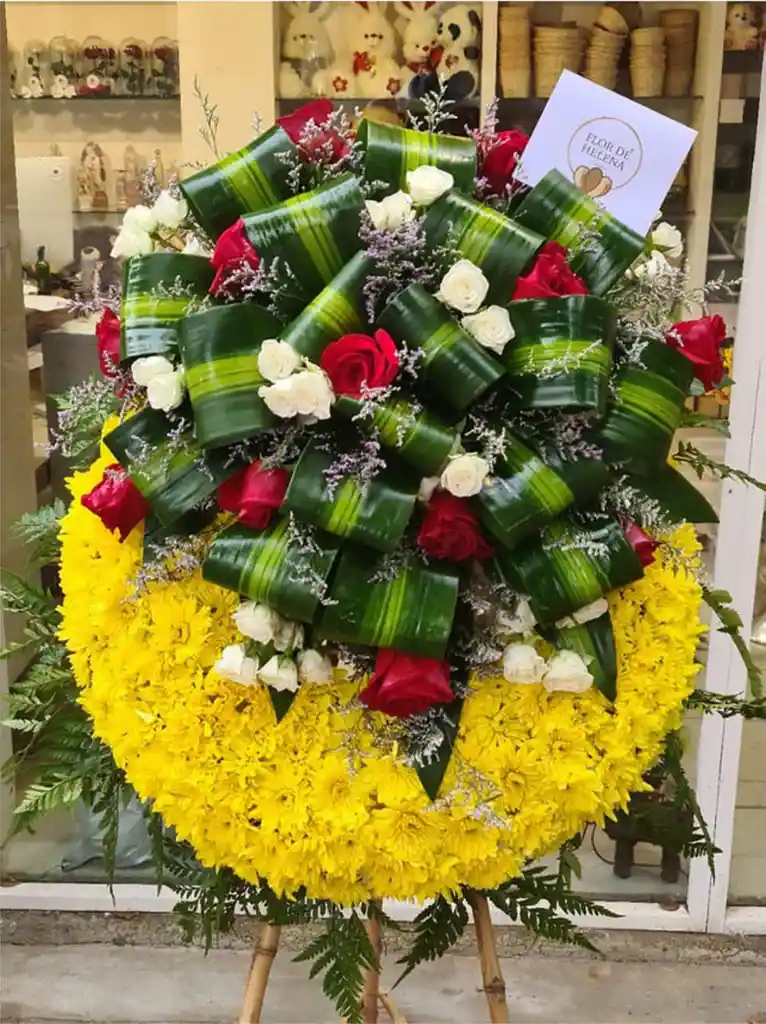 Corona Fúnebre elaborada por Flor de Helena Floristería con una bella combinación de follajes y flores como rosas, minirosas, caspia, pompones, dracena, helecho cuero, que logra una composición simétrica con diversas texturas que evocan un estilo natural y sofisticado! Incluye tarjeta Nota: La cinta fúnebre tiene un valor adicional de $20.000 COP