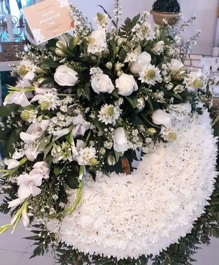 Corona Fúnebre Gladiolos y Rosas, elaborada con rosas frescas, astromelias, gladiolos, eucalipto, helechos, chirozas, gypshophilia, estrella de belen, rusco. aster blancoIncluye tarjeta