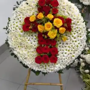 Elaborado Sobre Una Base De Margaritas Blancas Con Aplique De Cruz Con Rosas Rojas Y Amarillas Sobre Pedestal .