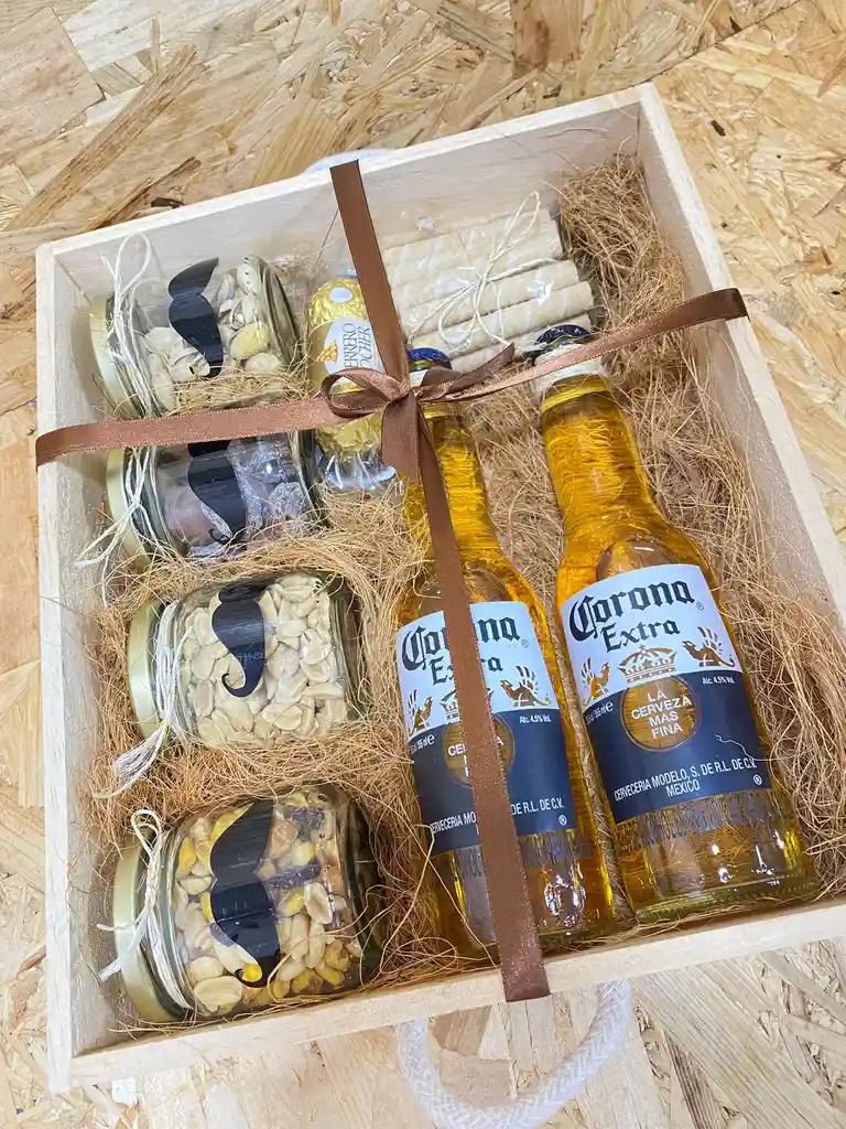 CAJA DE MADERA CON RELLENO DE COCO , 2 CERVEZAS CORANA , FERRERO X3 , BARQUILLOS , FRASCO DE MANI , FRASCO DE CHOCOLATES , FRASCO DE PISTACHOS , FRASCO DE FRUTOS SECOS , EMPAQUE CON CINTA DE TELA , TARJETA Y 2 GLOBOS EN HELIO