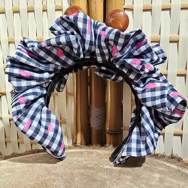 Es una diadema flexible como base, forrada y decorada en su alrededor con textil recuperado dándole una forma abullonada intencionalmente y creando firmeza con puntadas a mano. Inspiración: Esta joya está inspirada en los atuendos/indumentaria de nuestras matronas palenqueras, recreando las arandelas de sus polleras Upcycling: Nuestros productos son únicos ya que reutilizamos textiles para mitigar un poco más la carga de la industria de la moda. Beneficios: Son piezas que no aprietan, no tallan ni molestan. Horman la cabeza para mayor ajuste. Nuestras joyas crean un efecto de empoderamiento y belleza a la hora de colocárselos. Manejamos textiles de excelente calidad Garantía: Nuestros productos tienen 6 meses de garantía (No se devuelve dinero, solo se cambia por un producto de la misma referencia o del mismo valor, en caso de no tener el mismo valor y superarlo, el cliente tiene que asumir y pagar el excedente). Lavado: Estos son piezas que no se pueden meter en lavadoras ni secadoras. Se limpia con un pañito semi húmedo y con Frotex como jabón para desmanchar No aplicarle ni químicos, Clorox, Varsol, entre otros productos. Dejar secar al clima Recomendaciones: Para evitar que tu producto corra el riesgo de mancharse o dañarse por algún líquido, recomendamos guardar en su mismo empaque después del uso. Se puede utilizar con todo tipo de ropa, tanto monocromático como contrastado. Se usa un poco más adelante de la mitad de la cabeza Se puede usar sobre el cabello o recogiéndolo (Esto va a gusto de la persona) La diadema va detrás de las orejas. Se puede usar en el diario, trabajo, vacaciones o para eventos especiales (Esto va a gusto de la persona)