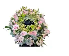 HERMOSA CORONA FUNEBRE COMPUESTA POR 30 ROSAS ROSADAS, 3 PAQUETES DE ASTROMELIA BLANCA Y ROSADA, CON FOLLAJE DE CANTO DEL INDIO