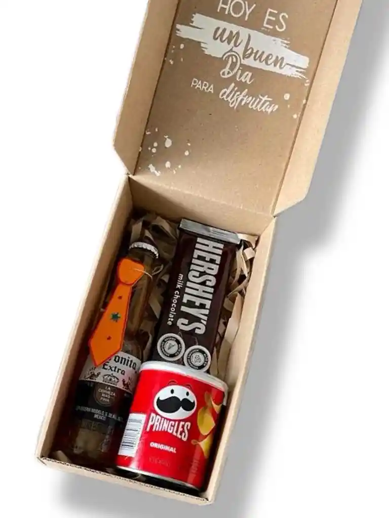 Coronita Box incluye: 1 botella Coronita (210 ml), 1 Papas Pringles (37 g), 1 Hersheys Milk Chocolate (43 g), caja con mensaje, papel picado, moño y tarjeta a elección. Tarjetas disponibles: Cumpleaños, amor, feliz día, feliz día, mujer, feliz día, hombre, mamá, papá, San Valentín. La caja se envía en una bolsa sellada con sticker alusivo a la celebración.