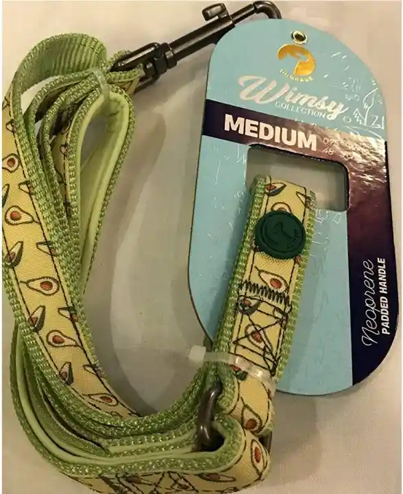 Esta es una bonita correa de perro mediana de la colección Wimsy de Doghaus. CORREA: 122 cm de ancho x 2 cm de ancho. Tiene aguacates sobre un fondo verde. Tiene un asa acolchada de neopreno y un cierre dorado. herrajes de seguridad metálicos