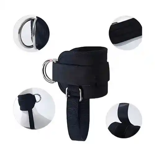 diseñadas para su uso en máquinas de cable y poleas, Especificaciones Técnicas Material: Fabricadas en neopreno acolchado de alta densidad y nylon reforzado para mayor durabilidad y comodidad durante el uso. Sistema de Cierre: Cuenta con una correa de velcro de resistencia industrial, ajustable para adaptarse a diferentes tamaños de tobillo. Anillos de Enganche: Posee anillos en forma de D de acero inoxidable o acero galvanizado, diseñados para soportar cargas pesadas y asegurar una distribución equilibrada del peso. Diseño: Ergonómico y transpirable, diseñado para evitar rozaduras o cortes en la piel durante entrenamientos intensos.
