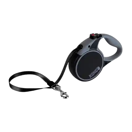 CORREA KONG RETRACTIL TERRAIN NEGRA Cada modelo cuenta con un mango ergonómico con soporte de agarre adicional para una sujeción cómoda, costuras reflectantes. y una cinta ancha, para una mayor durabilidad. Mecanismo intuitivo de freno y bloqueo funciona con un movimiento natural al caminar. Perfecto para el uso diario en tus caminatas favoritas con tu mascota. Disponible para todo tipos de perros.