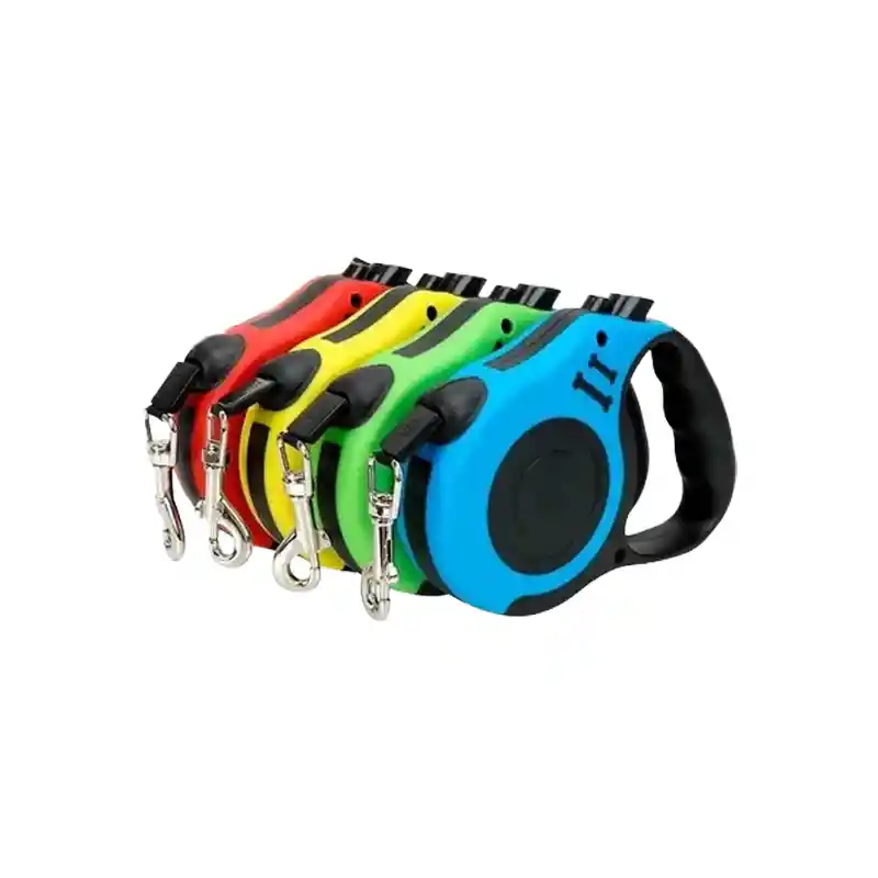 Correa retráctil para perro. Este tipo de correa permite a la mascota tener más libertad de movimiento durante los paseos, sin perder el control sobre ella. Cuenta con un mecanismo que permite ajustar y bloquear fácilmente la longitud de la correa. El diseño ergonómico y el mango antideslizante facilitan un agarre cómodo.