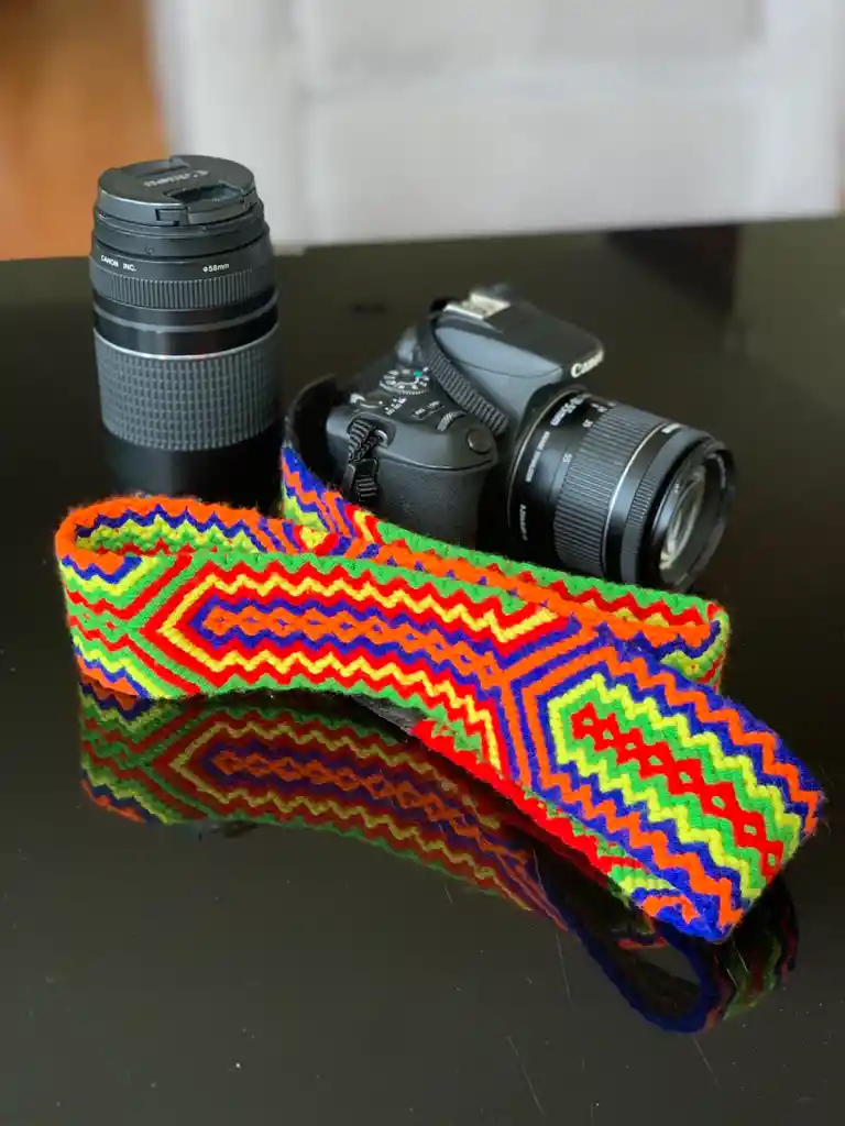 Correa wayuu para cámaras fotográficas, elaboradas por artesanos wayuu de la media guajira, adicionada con cuero y seguridad para tu camara