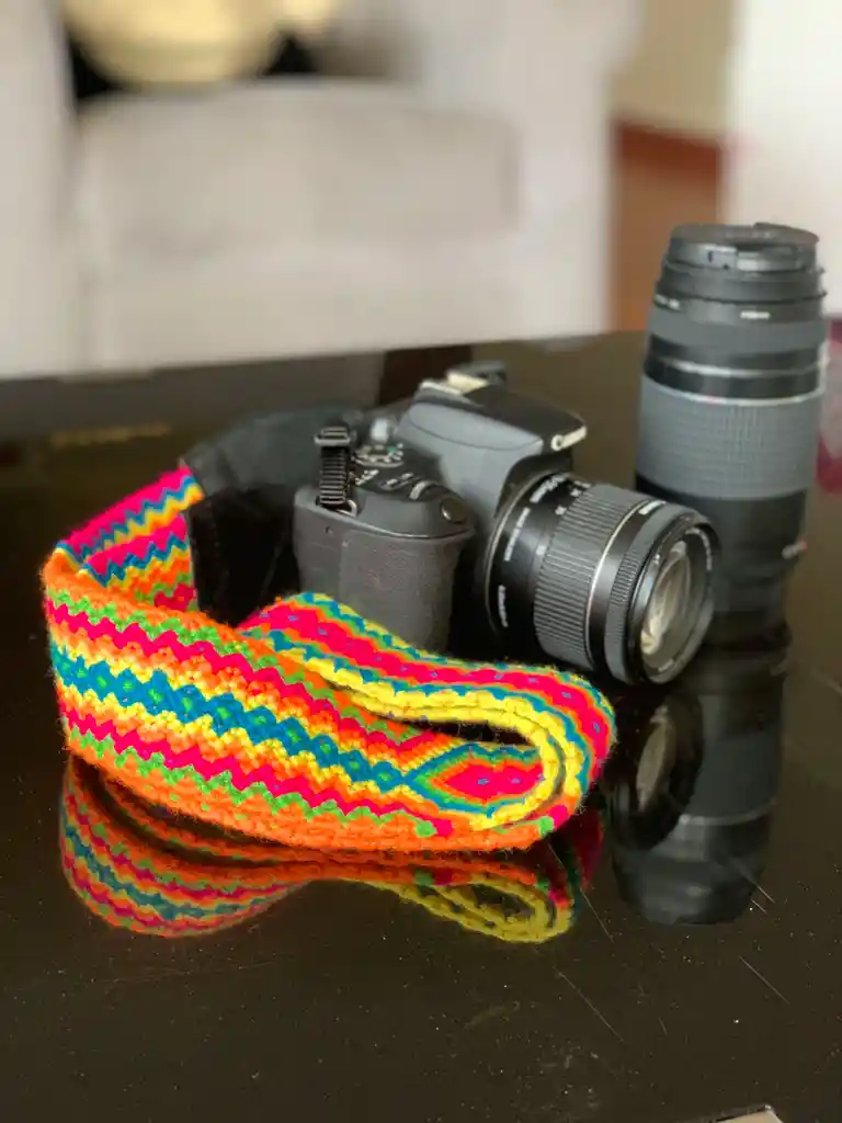 Correa wayuu para cámaras fotográficas, elaboradas por artesanos wayuu de la media guajira, adicionada con cuero y seguridad para tu camara