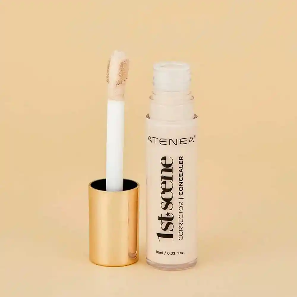 CORRECTOR LIQUIDO 1ST SCENE ATENEA CUT CREASE 10 ML : El corrector 1st Scene es de alta cobertura y te ayuda a camuflar tus ojeras, además mantiene esa zona hidratada Ideal para piel normal, seca o madura, es de acabado luminoso que proporciona un máximo cubrimiento de imperfecciones y manchas . Su fórmula contiene cafeína y ácido hialurónico que ayuda a desinflamar la zona. Viene en 6 tonos y es de larga duración. * características y beneficios El corrector contiene ácido hialurónico y cafeína, componenetes que te ayudan a desinflamar la zona y evitar que se cuartee, dando un aspecto fresco a tu piel. Te recomendamos que unifiques primero el tono de la piel con la base de maquillaje, y luego utiliza el corrector para ocultar las marcas y las ojeras. * como se usa Aplica el producto directamente en la zona más oscura de la ojera y difumina con una mini blender o lengua de gato pequeña a toques, difumínalo bien con movimientos suaves y circulares.