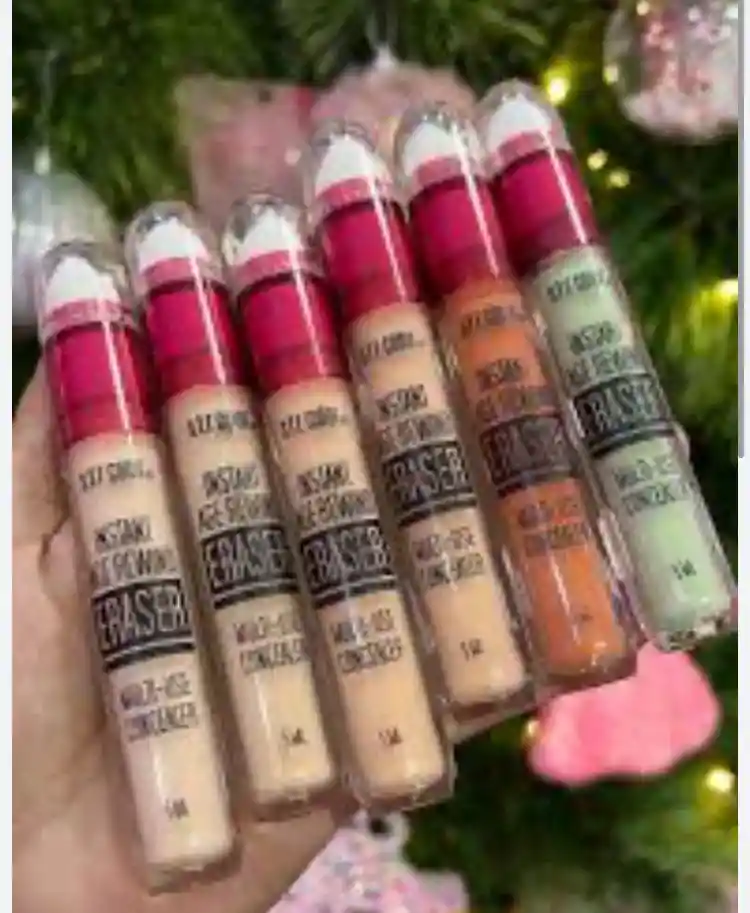Son correctores multiusos que sirven para ocultar ojeras, corregir el color, contornear e iluminar. La imagen muestra dos tonos, incluyendo un tono verde para corrección de color. Se caracterizan por tener un aplicador de esponja incorporado.