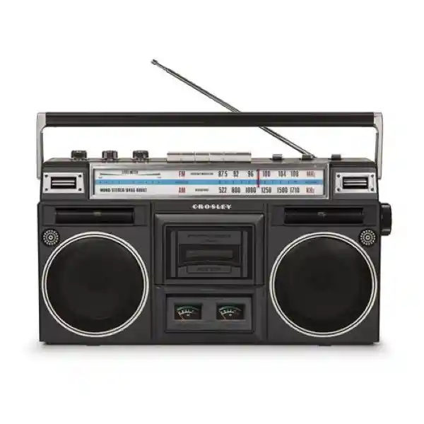 Ba-Ba-Ba-Bass Boost es Sólo Una de Las Nuevas Características Del Reproductor de Casetes Crosley Ct201. Acciona el Interruptor Para Obtener Graves Potentes y Para Que Los Dobles Vúmetros Analógicos Empiecen a Rebotar. También Tiene un Medidor de Nivel Digital. Este Boom Box Reproduce Cintas de Casete Sintoniza Radio Am/Fm o Conéctate al Bluetooth y Transmite la Música Digital de tu Teléfono a Través de Los Altavoces. También Puedes Reproducir Música Desde Una Unidad Usb Una Tarjeta Sd o Una Entrada Auxiliar. Ponle Las Pilas Gigantes Agárralo Por el Asa y Llévate Este Reproductor de Cintas Donde Quieras.
