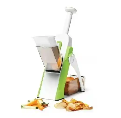 La cortadora de resorte Brava reduce su tiempo, esfuerzo y habilidad para cortar frutas y verduras. Es más rápido, fácil y seguro preparar todos los ingredientes que necesita para comidas saludables y deliciosas. Con docenas de configuraciones y un diseño fácil de usar, fácil de limpiar y fácil de almacenar. La bandeja de recogida está incluida en el juego. • Ideal para cortar fruta y verdura. • Posee 24 opciones de corte y 8 grosores diferentes. • Cuchillas en acero inoxidable. • Contiene: Recipiente para almacenar los cortes y cepillo de limpieza. • Posee en su mango un resorte el cual permite que realice el corte. • disponible varios colores, por favor preguntar por disponibilidad Sistema de tres cuchillas: no es necesario cambiar las cuchillas, ya que están integradas y se adaptan a muchos estilos de corte La manija se bloquea cuando está doblada o sin usar para mayor seguridad. Hace el trabajo de muchas herramientas / electrodomésticos de cocina.