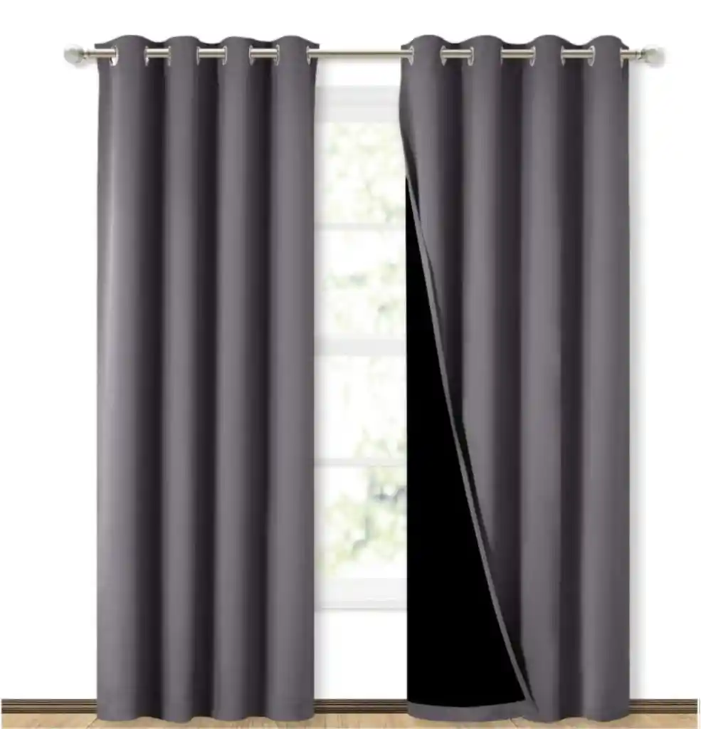 Cortina Aislante 100% Blackout X3 Doble forro (un lado gris y el otro blanco) Listas para colgar: 3 paneles de cortinas opacas por paquete. Cada cortina opaca con forro clásico mide 132 cm de ancho x 213,3 cm de largo. El diseño único del ojal plateado (diámetro interior de 4 cm) crea una elegancia casual para tu casa y hace que las cortinas sean fáciles de instalar y deslizar.