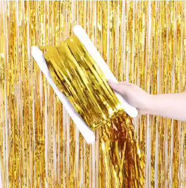 Cortina de tiras color dorado, ideal para decorar fiestas y eventos con un toque elegante y brillante. Fácil de instalar, ligera y perfecta para fondos de fotos o entradas. ✨🎉
