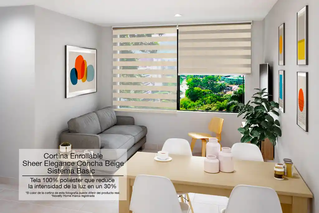 Características de la cortina Sheer Elegance BASIC La cortina Sheer Elegance BASIC con tela Concha beige, es una ECONÓMICA y novedosa propuesta ya que cuenta con una Discreta casetera en aluminio de líneas simples y sobrias más un invisible perfil de peso que cumple con darle una buena caída a la tela. La tela Concha en color beige está compuesta por franjas horizontales de tejidos sólidos y translúcidos 100% Poliéster, que se sobreponen entre sí permitiendo el control del nivel de luminosidad y privacidad en los ambientes. Al sobreponerse las franjas sólidas sobre las traslúcidas, esta tela poliéster logra bajar la intensidad de la luz en un 30% aproximadamente. Sus franjas horizontales opacas miden 8 cm de alto o grosor y sus franjas translúcidas miden de alto 7 cm aproximadamente. La tela es 3 cm aproximadamente más angosta que la medida final de la cortina: 1,5 de lado derecho y 1,5 de lado izquierdo. Su casetera y perfil de peso son en aluminio Su mecanismo es manual a cadena sin fin, con caída de 125 cm de largo de fácil manipulación que sube y baja la cortina. Su sistema de instalación es bastante práctico para instalarla a muro o a techo. Cortina de uso interior