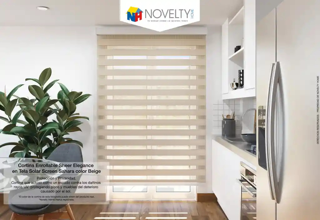 Cortina enrollable compuesta por franjas sólidas y traslúcidas, las cuales van de forma intercalada a lo largo de la cortina. La sobreposición de las líneas sólidas sobre las traslúcidas bloquean el registro hacia el exterior y las sólidas sobre las sólidas dejan libres las traslucidas permitiendo el paso de la luz al interior de los espacios. Su mecanismo a cadena la hace mucho más práctica y fácil de manipular. Sistema de fácil instalación y desinstalación Ideal para: dormitorios, sala comedor, biblioteca y áreas comunes.