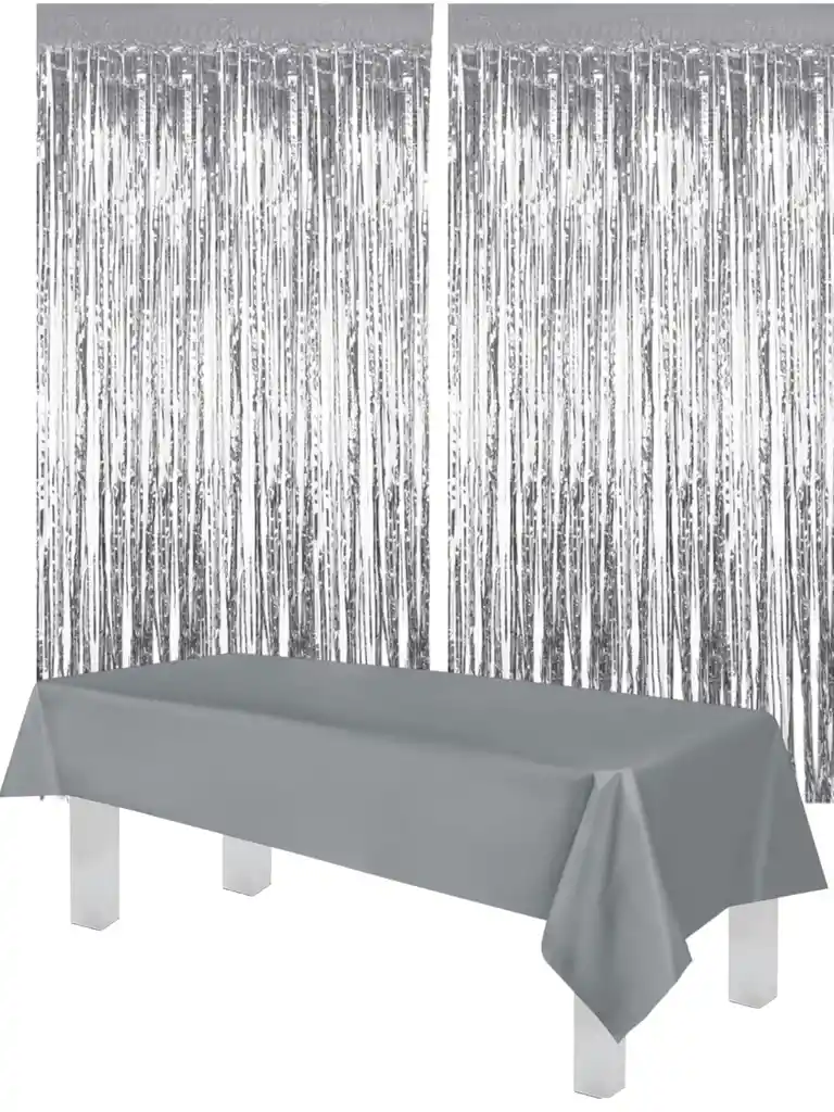 Cortinas Y Mantel Plástico Tipo Tela Cumpleaños Fiesta Plateado Decoracion