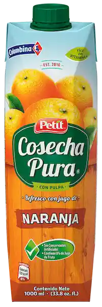 Ficha Técnica: Marca: Colombina Modelo: Petit Tipo de Producto: Bebida líquida Cantidad: 1 Litro Unidades por paquete: 1 País de Producción: Colombia Registro Invima: RSiA12I53212 Presentación del Producto: Envase Profundidad ITEM: 7 cm Ancho ITEM: 14 cm Altura ITEM: 12 cm Características de Jugo Natural Petit Cosecha Pura sabor a naranja x 1000ml Petit puede ser el acompañante en tu mesa al momento de merendar o disfrutar de una rica comida. Petit cosecha pura presentación de1 Litro con agradable sabor a Naranja.