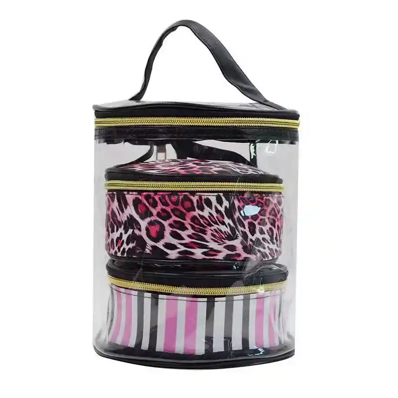 Cosmetiquera en material plástico y cierre en acero inoxidable de 17cm x 17cm, forma circular. Incluye dos cosmetiqueras dentro de la de mayor medida en la cual podrás guardar maquillaje y/o productos de cuidado facial. ideal para llevarla de viaje o para cualquier ocasión