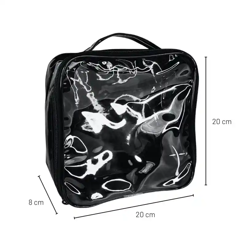 Cosmetiquera transparente y negra multifuncional Clásica y elegante para mantener tus cosméticos bien organizados. Material premium (PVC): duradero, resistente al agua, suciedad y arañazos, liviano, flexible, fácil de limpiar y de secado rápido. ¡Todo es fácil de encontrar! La parte superior es transparente, lo que permite ver claramente lo que está almacenado en el interior y así encontrar rápido y fácil lo que necesitas. Gran capacidad (20 x 20 x 8 cm) para organizar tus productos grandes o pequeños. Multifuncional: también lo puedes usar para viajar, ir al gimnasio y como organizador de diferentes artículos. Fácil de transportar: la cargadera es resistente y permite colgarla Cremallera doble de metal con finas costuras reforzadas con nailon a ambos lados, que hacen que la cosmetiquera sea más resistente y deslice suavemente.